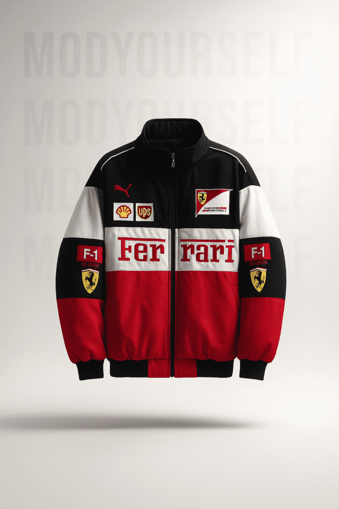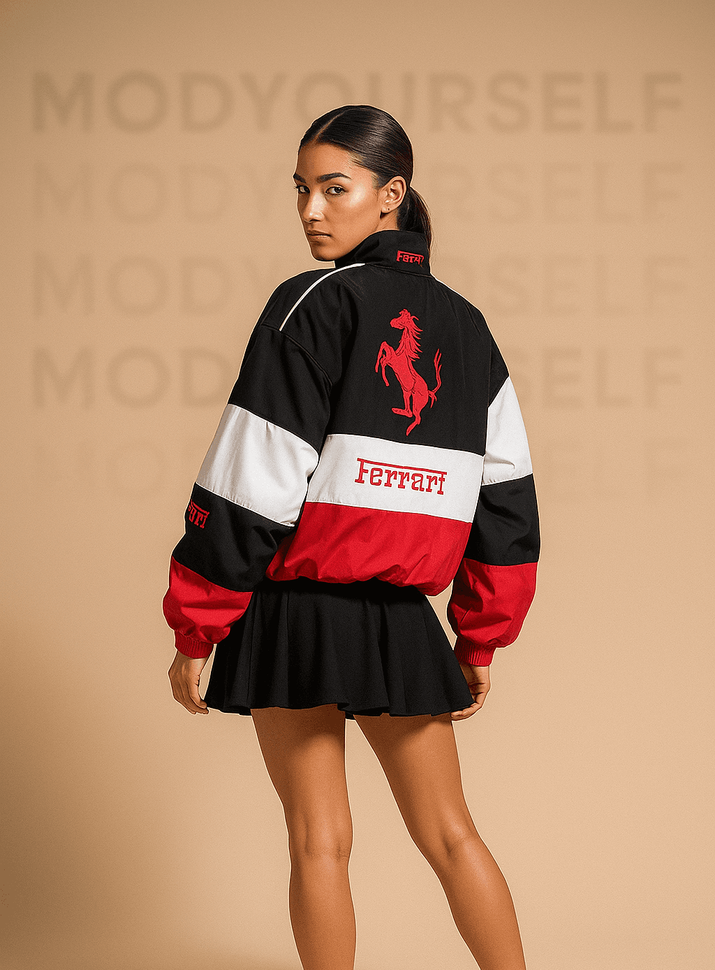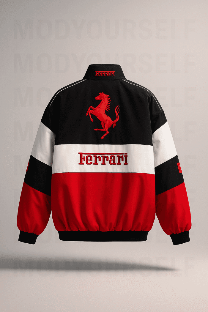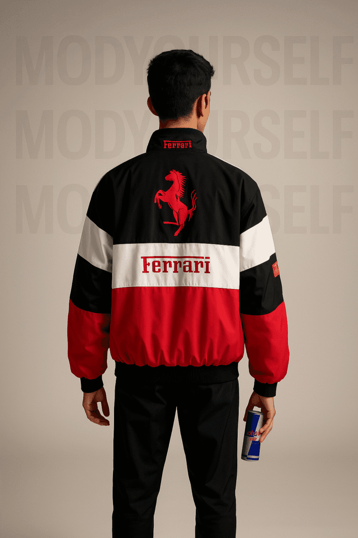 Inspired by Ferrari Monza legacy, the Trio-colour edition translates motorsport colors into a bold fashion statement. Three complementary panels are engineered with precision stitching and signature racing accents, delivering a jacket that reads as both a tribute to speed and an elevated piece of streetwear couture.